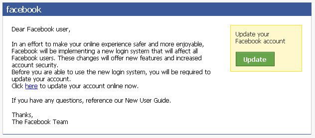 Another danger to look out for on Facebook is hackers. The most common way of being hacked on Facebook is by phishing. This is when the hacker “fishes” for information by creating a page that is identical to Facebook’s main screen.They’ll then send you an email asking for you to log in, this will then give them access to your account since they can record your email and password if you enter it.